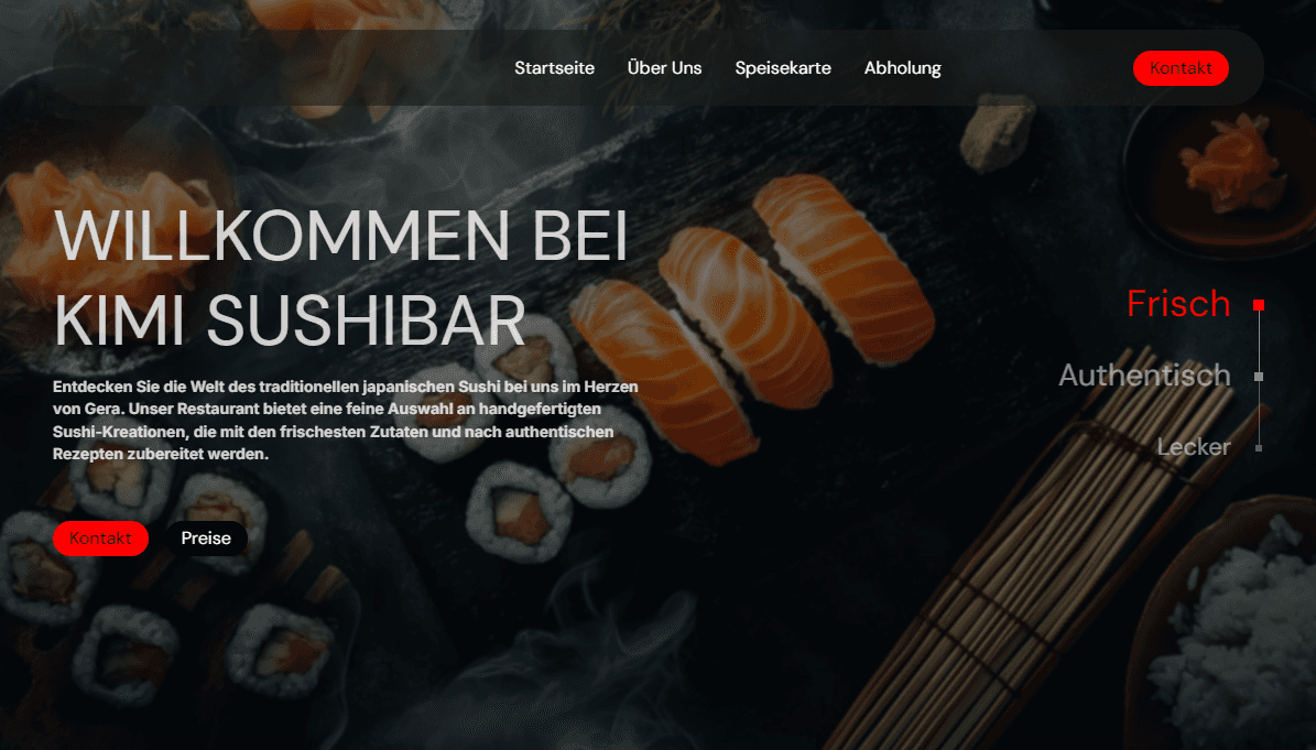 Das Design der Website spiegelt die Eleganz und Klarheit der japanischen Kultur wider, kombiniert mit modernen Webentwicklungspraktiken. Wir haben uns für eine minimalistische Farbpalette entschieden, die den Fokus auf die hochwertigen Speisen lenkt. Die Integration von visuellen Elementen wie hochauflösenden Bildern und dezenten Animationen sorgt für ein ansprechendes Nutzererlebnis. Jede Seite wurde sorgfältig gestaltet, um die Authentizität des Sushi-Restaurants widerzuspiegeln und die Besucher auf eine kulinarische Reise mitzunehmen.